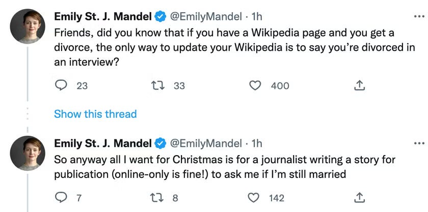 There is something inconsequential that has bothered me for a few years. In 2022, the author Emily St. John Mandel (known for her book Station Eleven, among others) did the following tweets: